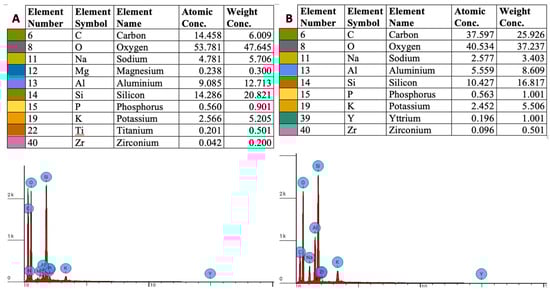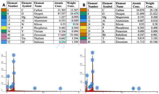 Chemical composition of zirconia for selected key elements. (A) Prior to fs-laser irradiation, and (B) following laser irradiation using a 20 J/cm2 fluence and 440 pulses.
