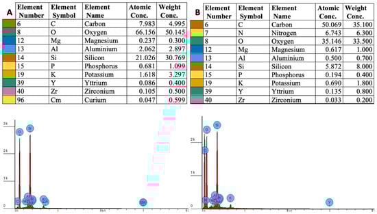 Sample morphological examination was performed using a scanning electron microscopy (SEM) system (Phenom™ XL G2, Thermo Fisher Scientific Inc., Waltham, MA, USA) under ×2550 or higher magnifications. This system was equipped with energy dispersive spectroscopy (EDS) for elemental analysis. The EDS analysis provided mean values and standard deviations of the relative weight concentration percentages (wt.%) for each element of interest (e.g., C, O, Al, and Si) in the identified areas. EDS measurements were collected from both laser-irradiated and untreated regions.