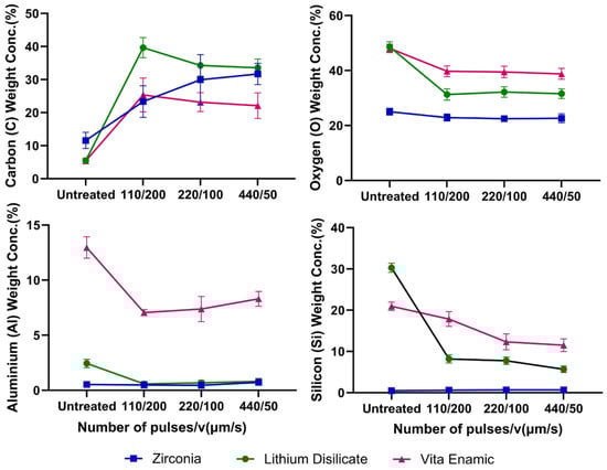 The wt.% analysis revealed significant changes in the elemental composition of constituent C, O, nitrogen (N), and constituent metals between control groups and fs-laser irradiated samples across all three types of materials studied. These results are collated and presented in Table 2, which details the types of samples and the corresponding number of fs-laser irradiation pulses. All laser treatments showed significantly reduced oxygen and increased carbon content in all three ceramic materials. Aluminum and silicon were both reduced significantly in LD and in VITA En.