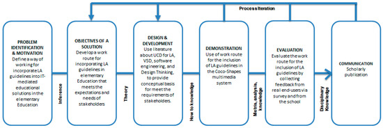 Consistent with the above, this work was conducted through a set of four stages, namely (i) identifying a problem related to the inclusion of LA guidelines in the context of Colombian institutions, (ii) objectives of a solution for incorporating LA in school contexts as an IT artifact, (iii) design and development of the artifact of the solution, (iv) evaluation of the work route for the inclusion of LA guidelines through the Coco Shapes multimedia system, and (v) communication of the analysis of the results and contributions offered by the work route, along with its identified limitations. The research method followed is presented in Figure 2 and is an adaptation of the objective of this research of the method presented by Peffers et al. [48].