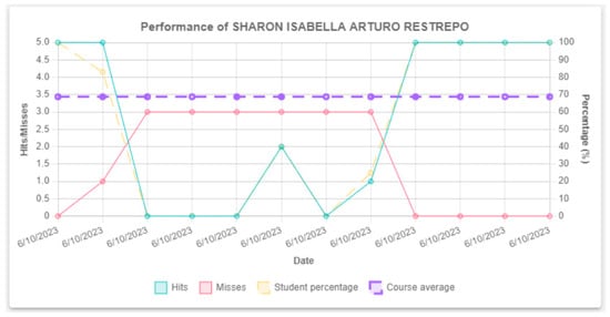 For LAP3, Figure 4 shows an example that includes the number of successes and failures, the student progress as a percentage, and the course average throughout the system’s use. The graph follows the LAD5 guideline and allows the student’s performance to be displayed and compared with the average results for the course. This allows the teacher to identify opportunities for the improvement of the teaching strategy for students who show low performance over time.