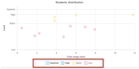 For LAD7, Figure 6 displays the student distribution by level (“Very High”, “High”, “Basic”, “Low”), with selectable user options for data viewing. The institution’s stakeholders define the levels according to its teaching strategy. Aligning with LAD2, time is on the X-axis. Hovering over a point reveals student details, including name, app usage time, and performance percentage for that level.