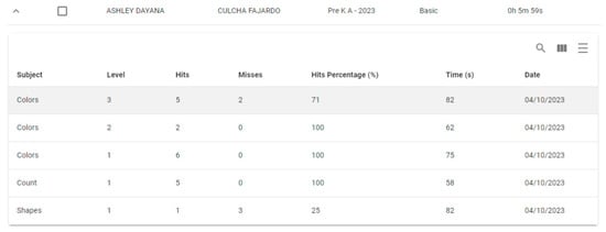 For LAA3, the system records the theme (colors, shapes, or counting), the date, and the time spent on each theme (the last time the student used Coco Shapes), as shown in Figure 7. With this information, teachers can identify topics that are of interest to students or that are complex and use this information as part of their teaching strategy.