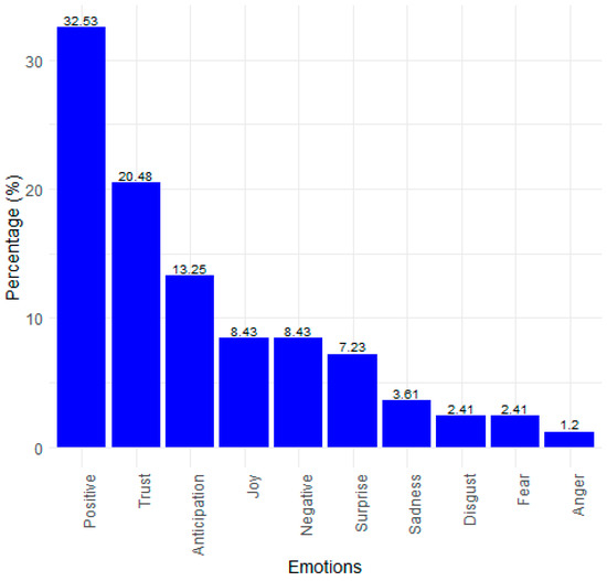 Figure 9 shows the distribution of various emotions, highlighting that positive emotions (32.53%) and trust (20.48%) have the highest values. This suggests that participants perceive the studied environment, likely related to the integration of LA into multimedia experiences, favorably and trustingly. This prevalence indicates that users find value and security in implementing the proposed guidelines. Additionally, the considerable representation of anticipation (13.25%) suggests that participants accept the guidelines and have positive expectations for their future implementation, reinforcing the guidelines’ effectiveness in generating interest and anticipation. Although joy (8.43%), surprise (7.23%), and sadness (3.61%) have lower representations, their presence points to areas where the guidelines can be adjusted to increase satisfaction and reduce stress or dissatisfaction. Negative emotions (8.43%) and disgust (2.41%) are low but present, indicating that while the general perception is positive, specific aspects could be improved. Emotion is a crucial component in the learning experience, and the presence of emotions, such as trust and positivity, indicates that the guidelines are aligned with users’ emotional needs, which is essential for engagement and learning effectiveness. Fear (2.41%) and anger (1.2%) are minimal, which is positive since such emotions can harm learning and collaboration. In summary, the distribution of emotions revealed by the figure justifies the relevance of these categories in the study, showing that the proposed guidelines are functional and emotionally resonant with users, which is crucial for their success and adoption.