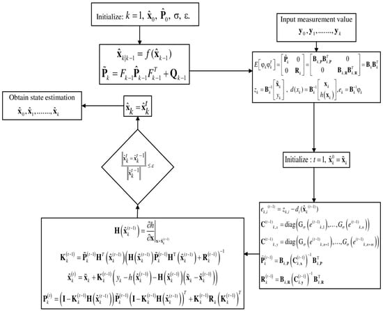 MCCEKF-NR is an approach for additional performance improvement. The flow diagram for a single cycle of the extended Kalman filter using the maximum correntropy criterion is shown in Figure 1 with nonlinear regression (MCCEKF-NR), which involves the nonlinear regression-based computation procedure for MCCEKF.