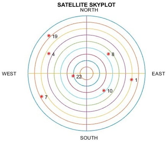 Figure 2 exhibits the test trajectory from the simulation. Seven GPS satellites (marked in red color dots) with the GPS ID number may be reached, as shown in Figure 3. The related Geometry Dilution of Precision (GDOP) is approximately 2.4, which ensures that the positional measurement precision is accurate due to the proper navigation satellite geometry. We concentrated on examining the location errors brought about by pseudorange entities, and these represent the caliber of the measurement model within the filters. The simulated vehicle is situated nearly 100 m above the earth’s surface.