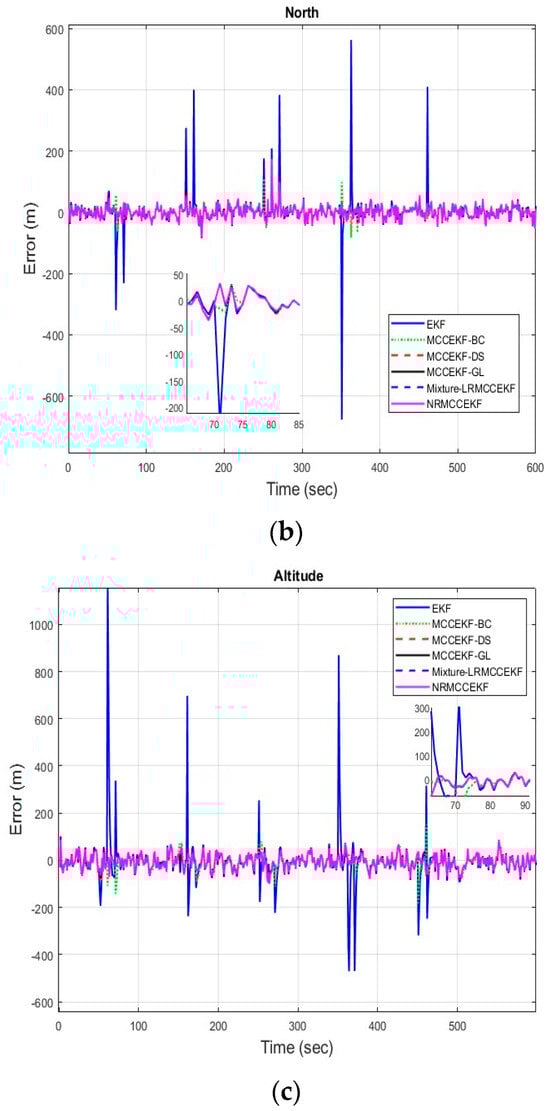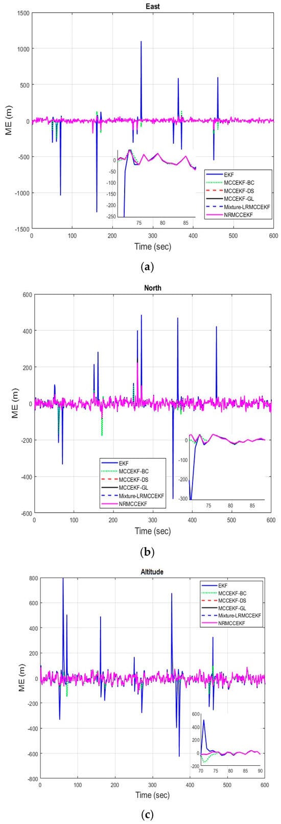 The six different filtering approaches’ precision in terms of mean errors for different positioning comparisons, such as EKF, MCCEKF-BC, MCCEKF-DS, MCCEKF-GL, MCCEKF-NR, and Mixture-LRMCCEKF are presented in Figure 5a–c. The performance comparisons for different algorithms are shown in Table 1 for different positions in terms of MEs, which reveals that Mixture-LRMCCEKF and MCCEKF-NR offer the best positioning accuracy among the approaches.