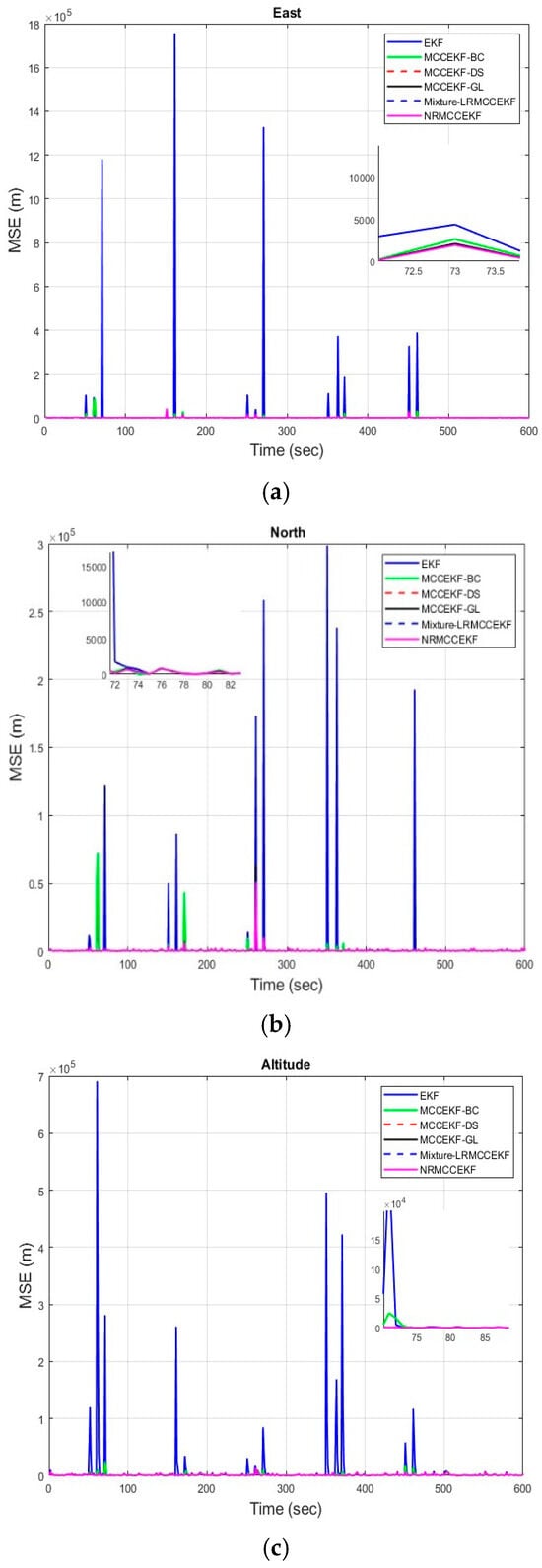 The mean square error (MSE) for different MCCEKF with respect to different positions: (a) east, (b) north, and (c) altitude.