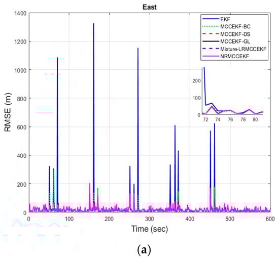 The six different filtering approaches’ precision in terms of root mean square errors for different positioning comparisons, such as EKF, MCCEKF-BC, MCCEKF-DS, MCCEKF-GL, MCCEKF-NR, and Mixture-LRMCCEKF, are presented in Figure 7a–c. The performance comparison for different algorithms is shown in Table 3, which reveals that Mixture-LRMCCEKF and NRMCCEKF offer the best positioning accuracy among the approaches in terms of RMSEs. In the meantime, MCCEKF-NR performs better than the EKF and the other MCCEKFs studied here, and estimates more accurately than the Mixture-LRMCCEKF. Furthermore, it is worth noting that the fixed-point algorithms in Mixture-LRMCCEKF and MCCEKF-NR are based on the iterative EKF converging to the most ideal result for the application in the GPS satellite navigations.