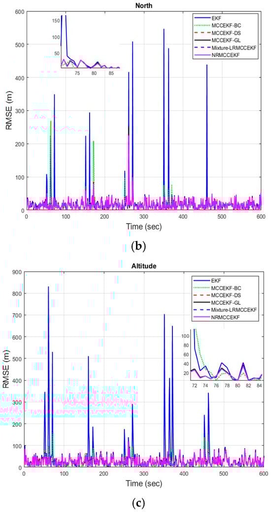 The root mean square error (RMSE) for different MCCEKF with respect to different positions: (a) east, (b) north, and (c) altitude.