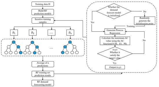 The Random Forest model is an effective method used to solve a variety of nonlinear regression problems that affect product demand [30]. This study will create a Random Forest forecasting model to better understand the demand forecasting challenge. The Random Forest parameters are critical to the model’s effectiveness, and this paper uses Bayesian optimization to tweak them. The algorithmic model architecture is shown in Figure 2.
