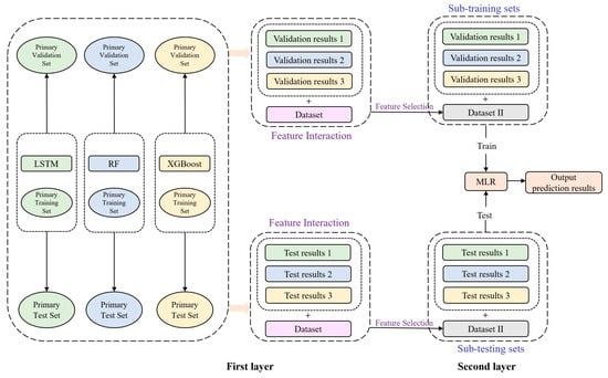 Layer 1: In this study, the dataset is divided into two parts, a training set and a test set. The training set is further split into a primary training set and a primary validation set. The primary training set is used to train the LSTM, RF, and XGBoost models, and the resulting base models are then used to make predictions on the primary validation set and primary test set, respectively. Next, we apply feature interaction and filtering to the results from both the primary validation and test sets. The filtered interaction features from the primary validation set, along with its results, are combined to form the secondary training set, which is used to train the metamodel in the second layer. Finally, the results and filtered interaction features from the primary test set are fed into the trained metamodel for testing. The training set lasts 48 months, from January 2018 to December 2021. The primary training set lasts from January 2018 to December 2020. The primary validation set lasts from January 2021 to December 2021. The test set lasts from January 2022 to December 2022.