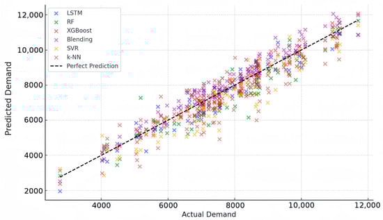 To better evaluate the prediction performance of each model, we plotted a comparison, as shown in Figure 6. The predicted and actual demand values of all models were near the perfect prediction line, indicating that these models fit the data well. Notably, the blending model’s predictions were generally close to the perfect prediction line, highlighting its effectiveness in handling high demand and periodicity issues, outperforming the other models. The LSTM, RF, and XGBoost models also showed predictions closer to the actual values, demonstrating high prediction accuracies. In contrast, the SVR and K-NN models exhibited a more scattered distribution of prediction results and deviated further from the perfect prediction line, indicating relatively poor prediction performances.