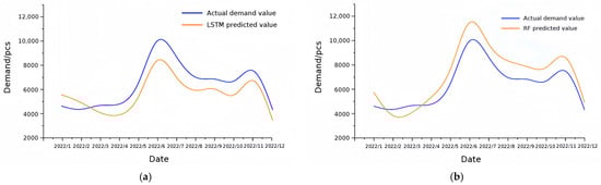 To further validate the performances of the dominant models in predicting actual demand, we plotted the fitting curves of each model on the test set, as shown in Figure 7. Figure 7 illustrates the comparison between the actual and predicted demand values on the test set for the LSTM, RF, XGBoost and blending models, respectively. These curves not only visualize the prediction ability of each model, but also provide a detailed analysis of each model’s performance under different time periods and demand fluctuations.