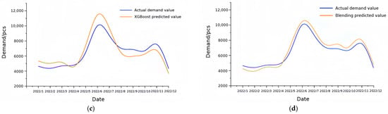 Figure 7a illustrates the fit of the LSTM model on the test set. The figure shows that the LSTM model performed well in capturing long-term trends and seasonal variations in the time series data. In contrast, Figure 7b demonstrates that the RF model could better fit certain periods with abnormal fluctuations in real demand, highlighting its advantages in dealing with complex non-linear relationships and high-dimensional data. Figure 7c presents the prediction results of the XGBoost model, which combines the strengths of gradient boosting and excels in handling a wide range of features and high-dimensional data. The model’s prediction curves on the test set reasonably matched the actual demand values, particularly during periods of high demand variation. Lastly, Figure 7d displays the prediction results of the blending model. By integrating the strengths of LSTM, RF, and XGBoost, the blending model showed outstanding performance in addressing high-demand and periodic issues. Its prediction curves exhibited the highest fit to the actual demand values, further validating the effectiveness of this combined model.