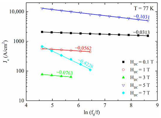 Critical current density as a function of frequency at 77 K at different DC fields. The slopes of the linear fits (their values are reported on the fitting lines) allow for estimating the values of the pinning potential U.