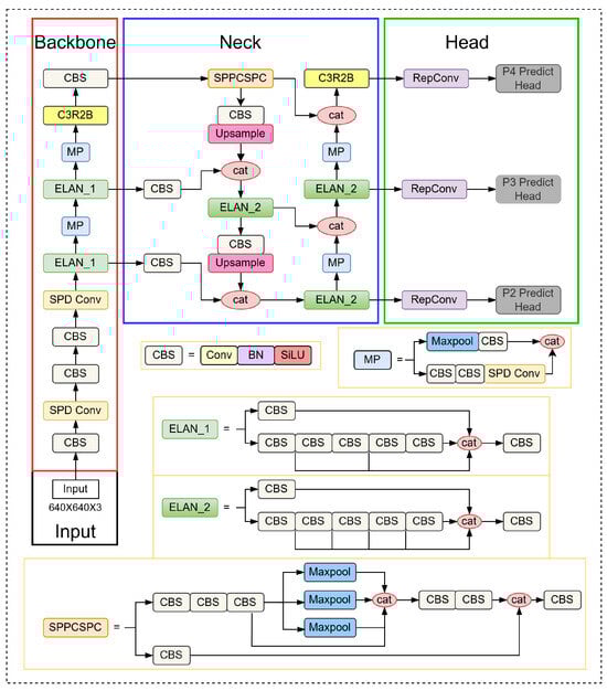 Proposed network structure. We introduced the P2 detection header and removed the P5 detection layer, and the SPD Conv was used to replace the original downsampling convolution. In addition, C3R2N replaced an ELAN_1. The network structure of C3R2N and SPD Conv are described in the following text.