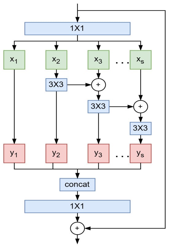 Suppose that the number of output channels of the feature graph of Res2Net after a 1 × 1 convolution becomes n; then, the split operation is used to divide the input feature graph into s subsets equally along the channel direction, which are represented by , where i = {1, 2,..., s}. Each feature graph subset has the same scale as the feature graph, but the number of channels becomes . There is a corresponding 3 × 3 convolution after each except for the first set of convolution . The convolution layer is represented by , and the output after is represented by , where i = {1, 2,..., s}. Forthe output current and the last , the result of the combination is input, so each before the input contains or fewer group characteristics and adopts hierarchical multiple-connection mode again at the same time so that each can extract more abundant and more scale features on the basis of .