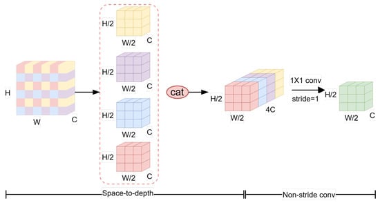 Traditional downsampling methods, such as max pooling and strided convolutions (SConv), have been fundamental components of CNNs. In most research scenarios, images have good resolutions and moderate-sized objects, which allows stride convolutions and pooling layers to skip large amounts of redundant pixel information while still enabling effective feature learning. However, these methods have several shortcomings, especially in tasks like small object detection in YOLO models. Strided convolutions, for instance, apply filters to the input with a step size greater than one, effectively reducing the spatial dimensions. This reduction in spatial resolution can cause critical details of small objects to be missed. Figure 4 shows the downsampling process of SConv with a stride size of 2 as an example. We can clearly see that SConv compresses the input feature map by a 3 × 3 convolution kernel with stride size of 2, which is 1/2 of the width and height of the original image, and directly filters out part of the feature information.