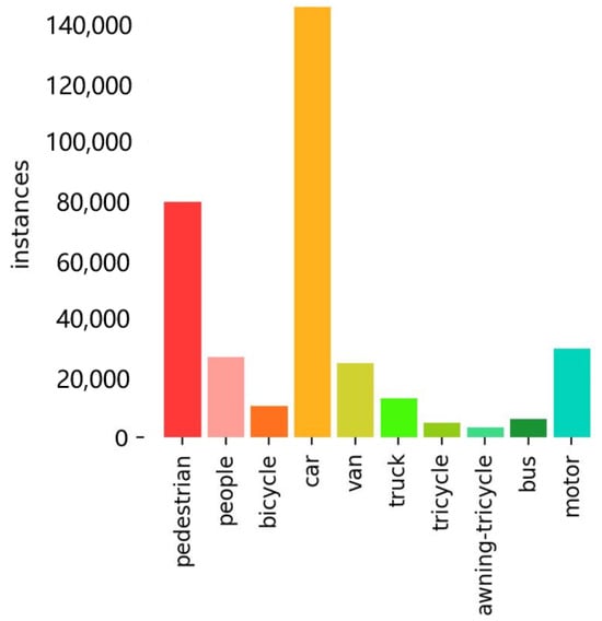 The Visdrone2019 data set is a comprehensive and challenging benchmark designed for visual object detection and tracking tasks in drone-captured imagery. It comprises over 10,000 images and video sequences captured by drones flying over diverse urban and rural environments. The data set includes a wide range of objects, such as pedestrians, vehicles, bicycles, and tricycles, annotated with precise bounding boxes and detailed labels. Figure 6 shows specific target categories and tag count information.