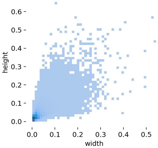 Height and width distribution of the training set target box. According to the color depth, most of the data set targets are much smaller than one-tenth of the original image.