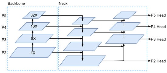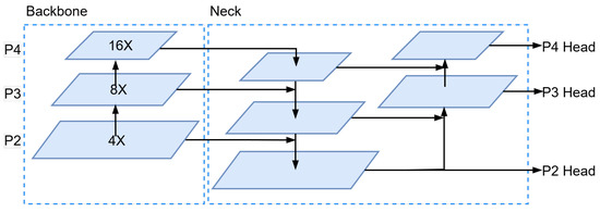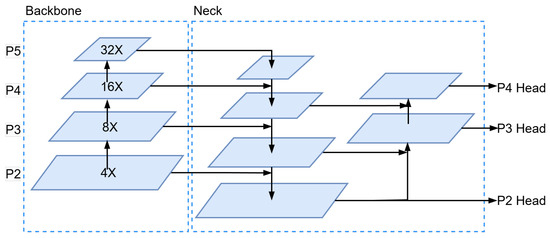 To verify the detection performance of the YOLOv7 network model by adding a P2 detection header and removing the P5 detection layer, the following experiments were conducted based on the Visdrone2019 data set: For Experiment 1, the structure of the benchmark model (YOLOv7) is shown in Figure 8; for Experiment 2, the P2 detection head was added, whose structure is shown in Figure 9; for Experiment 3, the P5 detection head was removed on the basis of Experiment 2, but P5 downsampling was retained, and its structure is shown in Figure 10; for Experiment 4, the entire P5 layer was removed, and its structure is shown in Figure 11.