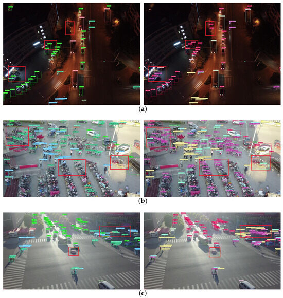 Detection results between YOLOv7 (left) and the proposed algorithm (right). (a) Dark environment. In front of the store, where there is light, because the object is too small, the left picture has an obvious missed detection. In the dark environment, the color of the target image is close to the background color, especially in the place where the bottom of the tree is blocked, and the left image is also missed. (b) Dense small-target image. In the dense small-target image, the missed detection is obviously very serious. Although the right image also has a missed detection, it is significantly improved compared with the left image. (c) Scene with a light change. In the scene with the light change, the target-detection effect of the two figures is not very different, and the problem of the left figure is still the target density caused by missed detection, as well as the obvious false detection in the middle of the figure.
