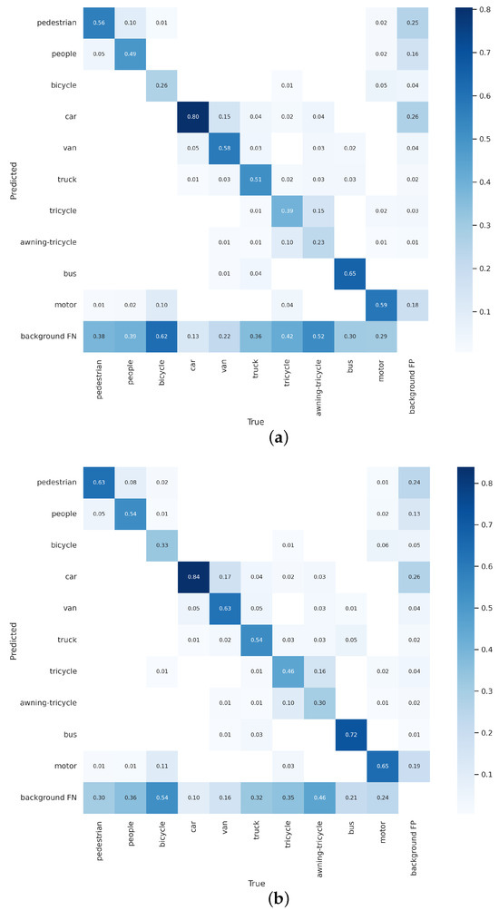 Confusion matrix graph. The diagonal data in the figure are the probability of correctly detecting the target, the background FN is the missed rate, and the background FP is the false detection rate. (a) YOLOv7. (b) Method of this paper.