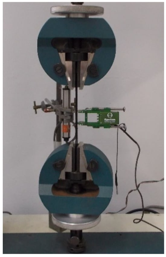 Prior to testing, a clip-gauge extensometer is attached across a 50 mm reference length to measure extension and thus longitudinal strains (see Figure 3). The test specimen is clamped into the jaws of a Tinius Olsen HK25 Universal Testing Machine and, in accordance with ISO 527-1 [], is loaded in tension at a rate of 1% of the reference gauge length per minute, i.e., 0.5 mm/min, until failure, equating to an average strain rate of 1.67 × 10−4 s−1. The resulting stress–strain graphs are shown in Figure 4.