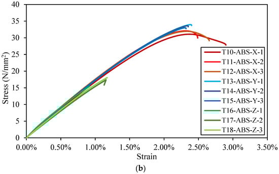 Stress–strain curves obtained from tensile testing of (a) PLA; (b) ABS.