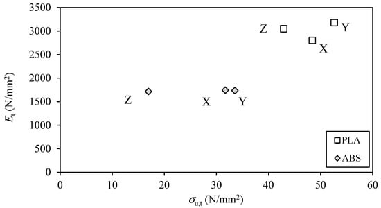 The ultimate tensile strength σu,t, tensile elastic modulus Et, strains at ultimate tensile stress εu,t and tensile fracture strains εf,t determined for each specimen are shown in Table 2, while average values for these properties for each layering orientation are shown in Table 3. It can be seen in Figure 5 that the printed PLA material is stiffer and stronger across all orientations than the printed ABS material, while in Figure 6, it can be seen that the ABS material is more ductile. These findings agree with previous test results for 3D-printed PLA and ABS [,,,,,,,,,,,,] and confirm that, when loaded parallel to the printing toolpath, i.e., in the X and Y orientations, PLA and ABS can outperform conventional structural materials like timber, concrete and brick in terms of the tensile strength (approximately 50 N/mm2 and 30 N/mm2 for PLA and ABS, respectively), suggesting useful applications in resisting loads; however, the relatively low stiffness of these printed materials (PLA 2900 N/mm2; ABS 1700 N/mm2) requires careful consideration in terms of allowable deformations and serviceability, but applications in aerospace, automotive and other mechanical contexts, in addition to temporary applications in construction, are envisaged.