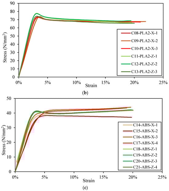 Stress–strain curves from compressive testing of batches: (a) PLA1; (b) PLA2; (c) ABS.