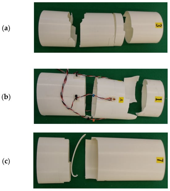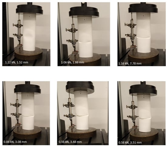 The failure mode observed in all specimens eventually involved ruptures initiating at the extremes of the minimum diameter, i.e., either points A or C in Figure 11b. As shown in Figure 14 for the PLA specimens, the point of failure was not necessarily at mid-height. In Figure 15, the deformations observed in the more ductile ABS specimens indicate the evolution of local buckling of the tube walls before a more catastrophic rupture of the material; these losses of stiffness are also evident in the load–end shortening curves shown in Figure 13. This behaviour is commensurate with the stable post-yield response shown in Figure 8c from compression testing of the ABS material specimens.