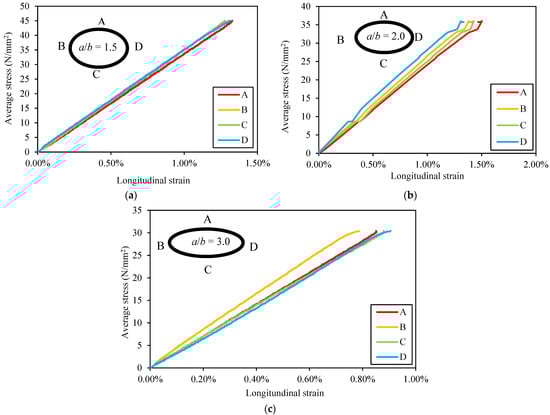 In Figure 16a–c, the strains recorded at mid-height during testing of PLA specimens EHS10 (a/b = 1.5), EHS01 (a/b = 2.0) and EHS16 (a/b = 3.0), respectively, are plotted against the average compressive stress. It can be seen for each specimen that the highest strains are recorded at either point A or point C. These points are the extremes of the minimum diameter where the local curvature and hence stiffness are lowest, and thus failure initiates; this is in agreement with the failure and deformation modes shown in Figure 14 and Figure 15. In Figure 16a, it can be seen that the strain readings are almost identical at each strain-gauged location for EHS10, which has an aspect ratio a/b = 1.5. With increasing aspect ratio, the discrepancy between the strains at the extremes of the minimum and maximum diameters increases, which is particularly apparent in Figure 16c for EHS16 with a/b = 3.0 when comparing strains at points C and D. This effect can be contributed to the increasing difference in curvature at points A/C and B/D with increasing aspect ratio.