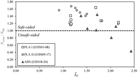 In Figure 18, values of Nu,exp/NR are plotted for all specimens in order to assess the safety and accuracy of the design method. For the PLA specimens, it can be seen that the design method provides safe-sided results without being overly conservative, with accuracy increasing with slenderness. It is noted that the level of accuracy is relatively similar for all aspect ratios. For the ABS specimens, the design predictions are reasonably accurate and safe-sided. As shown in the case of EHS21, reductions in strength due to imperfections can lead to design predictions being overestimated and thus it is imperative that manufacturers pay heed to quality control during fabrication. Overall, the results confirm that, with appropriate rescaling of parameters, the design method proposed by [] is suitable for use with slender 3D-printed PLA and ABS elliptical tube members in compression. It is envisaged that exercises conducted using design rules for other slender steel cross-sectional geometries could find similar use for a variety of potential 3D-printed profiles.