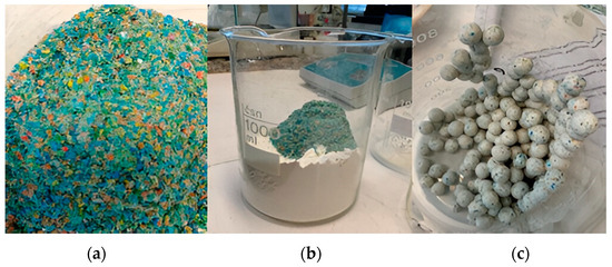 - As it has already been proven that the kaolin has zeolitization capacity [21], it has been used as a main component in mixtures with different proportions of plastic, namely 0, 5, 10, and 20 wt.% of powdered MPF (Figure 1b), in order to check how it affects the manufacturing process of zeolitic lightweight aggregates (ZLAs).