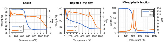 DSC-TGA plots of the raw materials used in this study. Heating ramp: 25 °C/min; atmosphere: air (clays). Equipment: SDT Q600 of TA Instruments (New Castle, DE, USA).