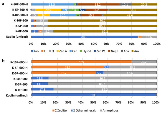 Mineralogical composition of the kaolin and the lightweight aggregates obtained from it and different proportions of MPF (0P, 5P and 10P mean 0, 5, and 10 wt.% of MPF added): (a) Kao = kaolinite; Ill = illite; Q = quartz; Zeo A = zeolite A; Can = cancrinite; Hysod = hydrosodalite; Zeo P1 = zeolite P; Neph = nepheline; Ana = analcime; Am = amorphous phase. (b) Differentiation between zeolites, other minerals and amorphous phase.