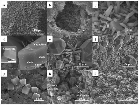Images taken by SEM of zeolitized samples: (a) zeolite crystals along the entire section of sample K-10P-600-H, with rounded crystalline aggregates of cancrinite on the left and aggregates of elongated crystals of nepheline and cancrinite on the right; (b) elongated crystals of nepheline and cancrinite within a pore and (c) detail view of these in K-0P-600-H; (d) tip of an acicular crystal of cancrinite with hexagonal cross-section and tip of a nepheline crystal showing characteristic Miller indices according to Hansen and Fälth [29]; (e,f) analcime crystals with trapezohedral habit and, in (e) together with other nepheline tabular/columnars in K-5P-600-H; (g) cubic crystals of zeolite A in K-0P-600-H; (h) crystalline aggregate with cubic crystals zeolite A, pinecone aggregate of zeolite P1, and lepispheres of hydrosadalite or zeolite P1 in K-5P-600-H; (i) pinecone-like crystalline aggregate typical of zeolite P1 in K-10P-600-H.