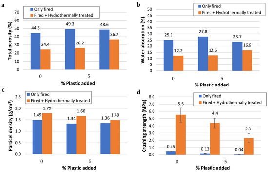 Technological characteristics of the zeolitic lightweight aggregates obtained from kaolin and different proportions of MPF: (a) total porosity; (b) water absorption; (c) particle density; (d) crushing strength.