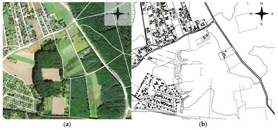 The landform is rather uniform here. Escarpments are localized in the middle part of the area. The land elevation (~265 m) shows that the area is lowland. Development of the terrain consists of meadows, agricultural fields, and pastures in the east, allotment gardens in the southwest, apartment buildings and utility buildings in the north (Figure 2).