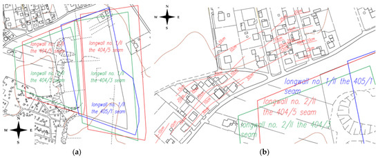 The exploited region against the background of a situational–altitude map: (a) edges of longwalls in the 404/3 (green lines), 404/5 (red lines), and 405/1 (blue lines) hard coal seams; (b) linear discontinuous deformations (ground steps and faults) caused by the extraction of hard coal (source: own study).