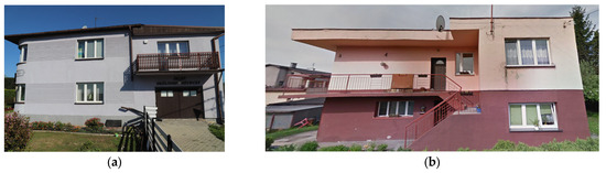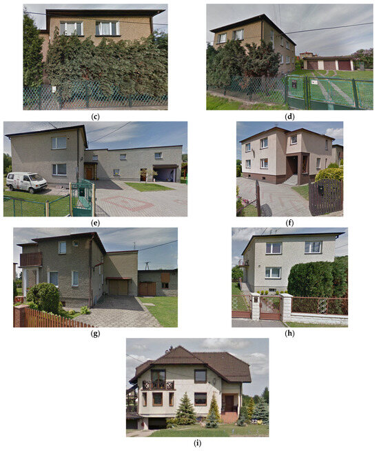 The residential buildings are single-family houses that usually have two floors (a ground floor and an aboveground floor), and their heights did not exceed 10 m. The horizontal projections of the buildings have the shapes of squares and rectangles with dimensions not exceeding 21 m × 15 m. Most of the objects have a wall-bearing structure, with ceilings made of concrete with steel girders. The walls are made of bricks or ceramic hollow bricks. The walls have a thickness from 0.22 m to 0.48 m. The buildings’ roofs serve as the ceilings, gables, or envelope roofs and are covered by bitumen felt layers or metal and ceramic roof tiles. The single garage is located near building no. 3 (B3) and has dimensions of 5.80 m × 10.35 m × 3.85 m (length × width × height). It is a three-car garage made of bricks. Pictures of the specific buildings are presented in Figure 4.