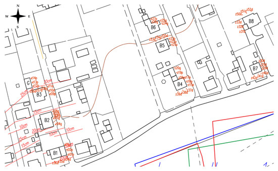 As previously mentioned, in order to compare the theoretical values of inclinations calculated by Bialek’s model with their real measured values, an observation network was established near nine objects (eight residential buildings numbered from B1 to B8 and one garage marked with the G letter), on which appropriate geodetic measurements were made.
