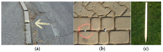 The methods of stabilizing the measurement points depended on the type of surface (asphalt—a metal pin 7.5 cm long, the 10LK model (Figure 6a); paving stones—a nail 10 cm long, the 10ZSO model (Figure 6b); lawn—a wooden picket 35 cm long (Figure 6c)).