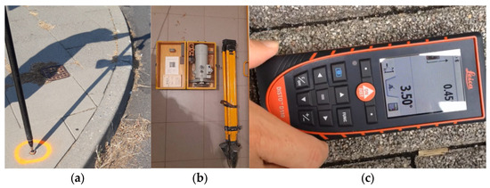 In addition to the situational and altitude surveys, double measurements of the horizontal distances between neighboring, observation points () were also carried out to determine the values of the inclinations occurring in individual sections (). They were measured using the Leica Geosystems D510 electronic distance meter with a reading accuracy of 0.001 m (Figure 7c). The error in determining the length between subsequent points was .