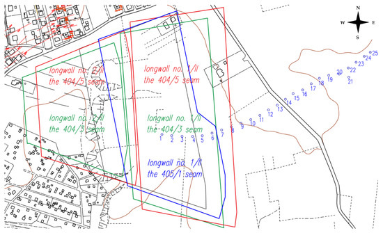 The discussed mining area is specific for two reasons. Firstly, it is an area with specific geometric conditions (relatively short longwalls with overlapping mining edges) and mining conditions (relatively small depths of longwalls compared to currently observed average exploitation depths, and the exploitation of the thick hard coal seams is divided into several layers and inclined at large angles) of the conducted exploitation, as well as the geological structure of the subsurface ground layers, which consist of loosely sands and clays, as already described in [57]. Secondly, this area is specific for social reasons, as it is inhabited by a local community that protects its property from damage caused by the mining plant, which is (or was) often the source of income for the residents and their maintenance. On the one hand, it is about the welfare and protection of the interests of the residents and, on the other hand, of the Jastrzebie Coal Company.