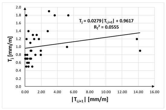 Figure 10 presents the correlation between the absolute values of practical inclinations observed in the terrain and their theoretical values calculated using Bialek’s model. As can be seen from the graph, their correlations were rather weak, because the value of the correlation coefficient did not exceed 0.24 ().