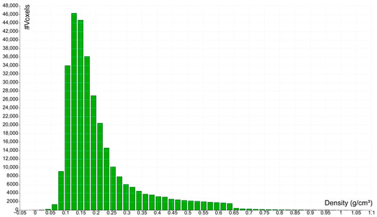 A voxelized anthropomorphic phantom, based on the CT scan (voxel size of 1.37 × 1.37 × 3.27 mm3) of a healthy male patient, weighing 72 kg and 166 cm tall, was created using ITK-Snap software (version 3.8.0) [18]. The phantom was then resampled to a cubic voxel grid with a voxel size of 2.21 mm using the “Resample Scalar Volume” built-in module of 3D-Slicer software (version 5.2.2) [19], applying the “nearest neighbor” algorithm [20]. Three spherical lesions were artificially introduced into the phantom’s liver, with diameters of 10, 20, and 30 mm. These lesions had a higher density than the liver parenchyma, i.e., for tumor tissue, compared to assigned to the surrounding tissue [21,22]. For the lung tissue, the actual spatial density distribution of the patient was assumed for this phantom, based on the HU-density calibration of the CT scanner. The phantom’s lung density distribution ranges from to , with a mean value of and a median of . A visual representation is provided in Figure 1, which displays a histogram of the voxel density values within the lung Region of Interest (ROI).