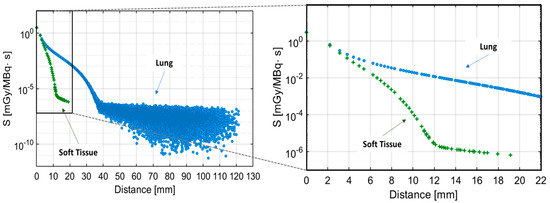 Comparisons between the VSV kernels in Figure 2 highlight the specific properties of radiation transport in lung tissue compared to ST. In the lungs, the AD increases considerably for any given source-target distance relative to ST, as does the radiation penetration in the medium. The most abrupt slope change in the lung VSV trend occurs at approximately 38 mm. This is well-correlated with the maximum penetration of the 90Y emitted beta radiation in the lung, whose maximum CSDA range is approximately 38.6 mm [31] for the β− end-point energy of 90Y; beyond that distance, the only contributions to the absorbed dose are due to bremsstrahlung radiation. Data scattering increases with the source-target distance. This is due to growing statistical uncertainty, as fewer and fewer interaction events are recorded when approaching and exceeding the maximum penetration range of beta radiation.
